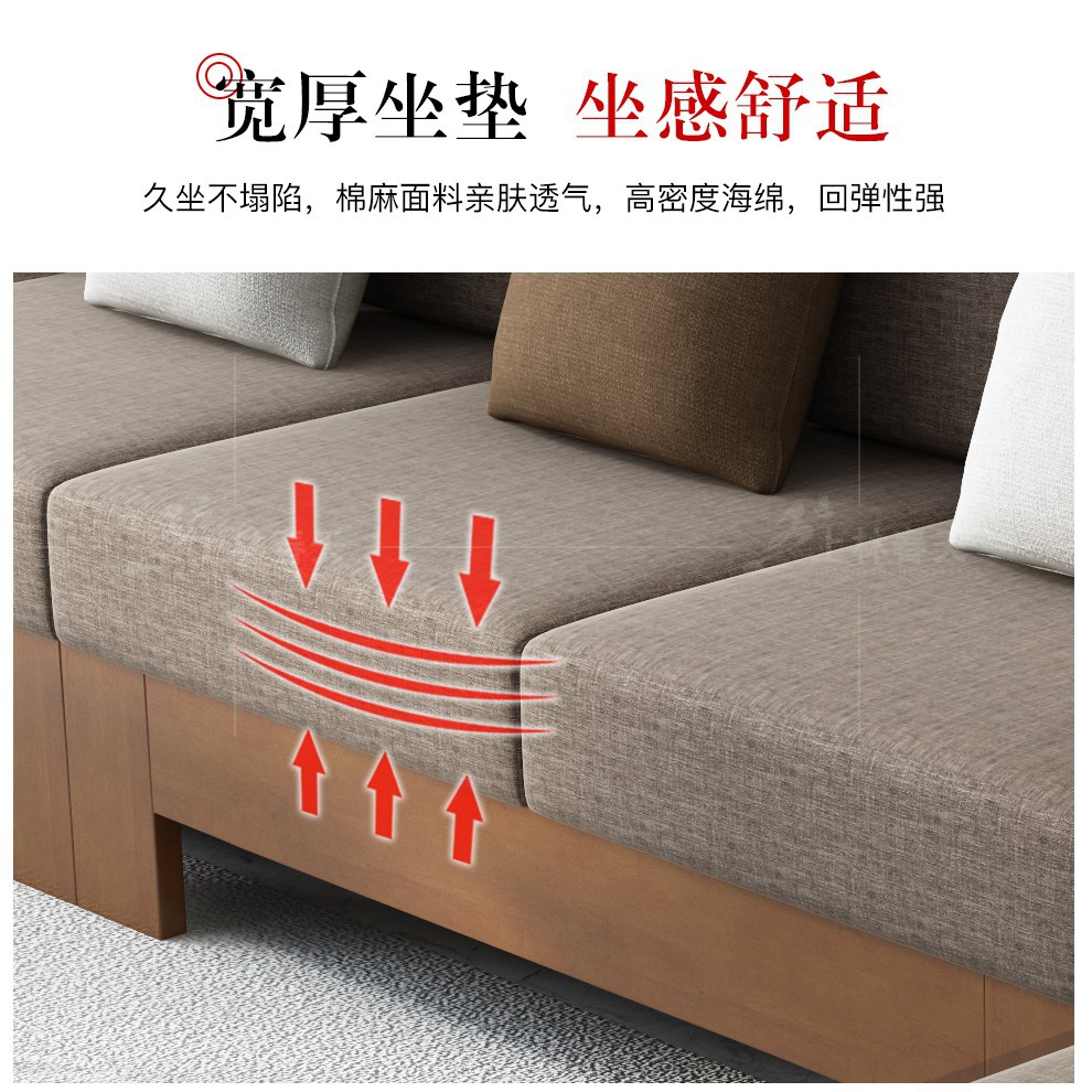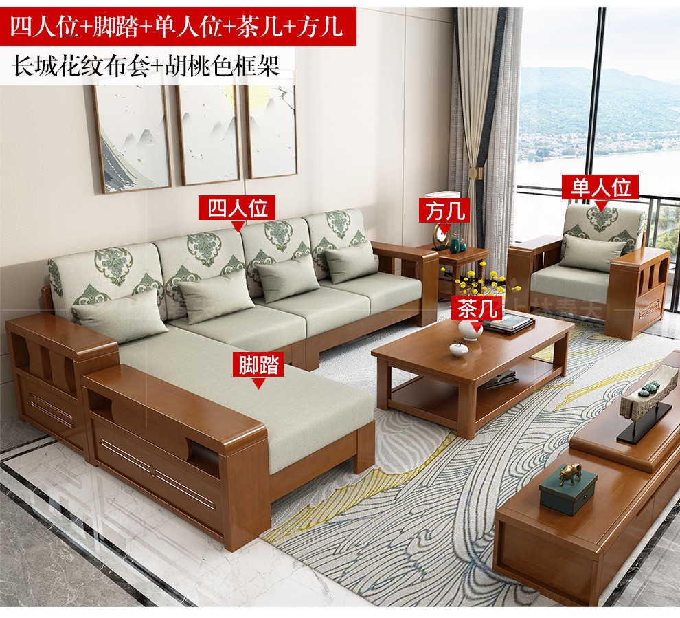 上林春のソファーの木のソファーの新しい中国式の布芸ソファーのセットは客間の家具の胡桃の色(布のカバーは万里の長城の模様の金を黙認します)の5人の位+茶の箱+貴妃の位+茶の何+方面を組み合わせます