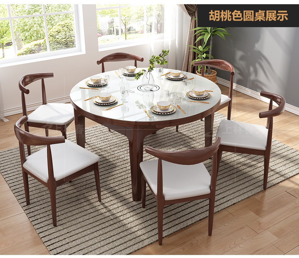 上林の春の食卓の実際の木の食事のテーブルと椅子の組み合わせは近代的な北欧の簡単で小さい部屋型が伸縮して折り畳む電磁炉の家庭の食卓の円のレストランの家具の胡桃の色(電磁のストーブの項)1.35メートルの1テーブルの6椅子を含みます。