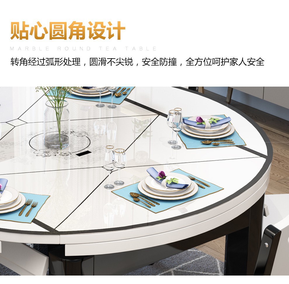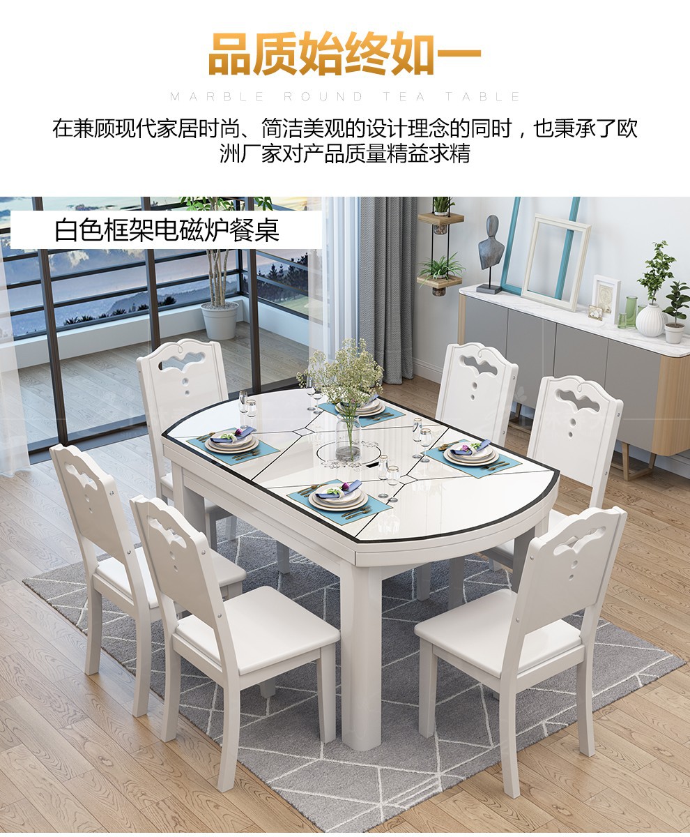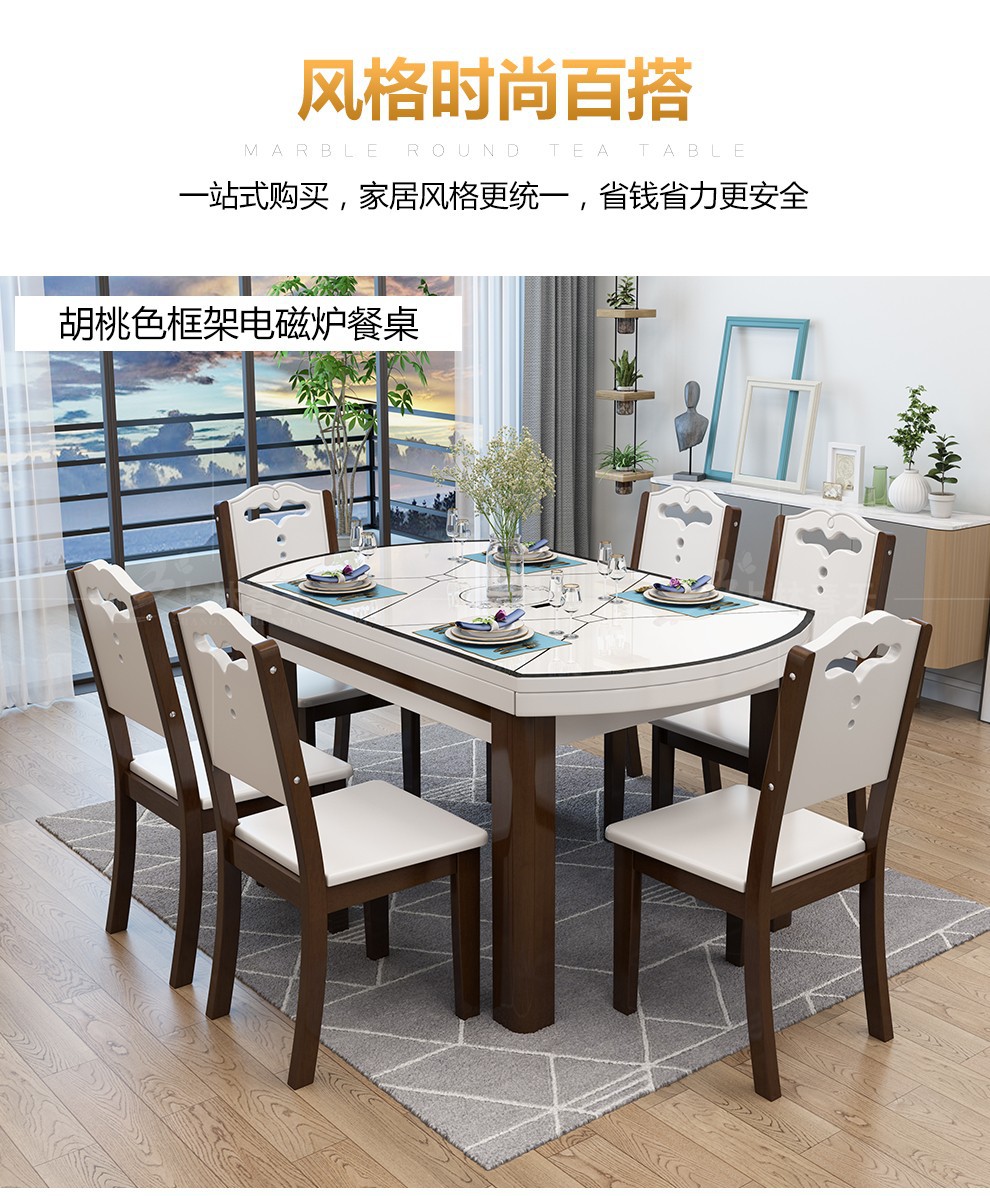 上林の春の食卓の実木の食卓の現代な簡約な風はテーブルの鉄骨化のガラスの食事のテーブルと椅子のセットの円形の食卓のレストランの家具の柚木の色(電磁のストーブの金)の1.35 M 1テーブルの8椅子に伸縮することができます。